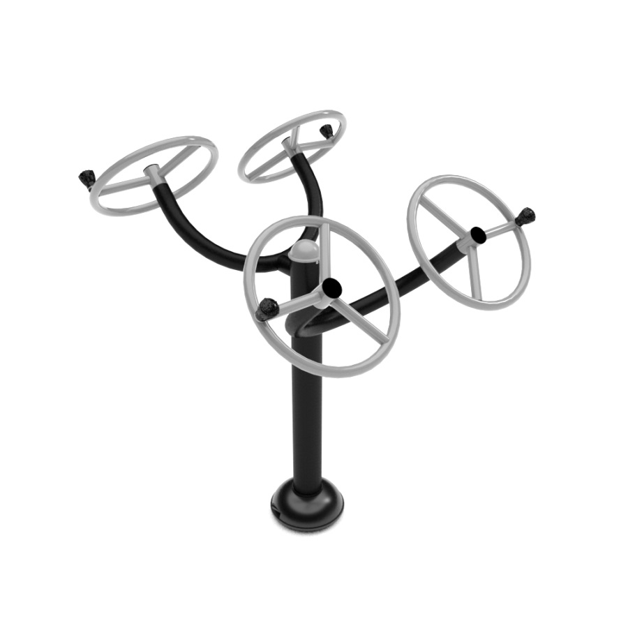 Wie man trainiert - Stellen Sie sich schulterbreit auseinander und stellen Sie sich so hin, dass sich Ihre Brust mittig zwischen den beiden Rädern befindet. Fassen Sie beide Griffe und drehen Sie die Räder so, dass sie so hoch wie möglich sind. Drehen Sie gleichzeitig das linke Rad gegen den Uhrzeigersinn und das rechte Rad im Uhrzeigersinn. Um die Effektivität der Übung zu erhöhen, wechseln Sie die Drehrichtungen ab. Führen Sie die Bewegungen gleichmäßig und kontrolliert aus. Erhöhen Sie die Anzahl der Wiederholungen, wenn sich Ihre Fitness verbessert.