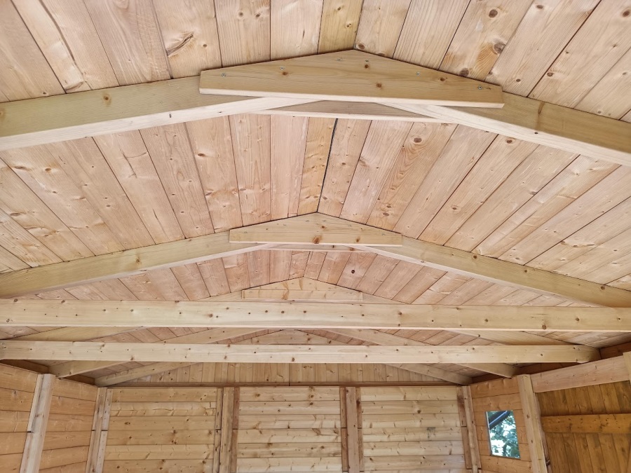 Massive Brettschichtholz-KonstruktionWandständer: 90 x 90 mm Vier-Lamellen-Brettschichtholz, hergestellt in hochwertiger nordischer Fichte. Spindel und Bodenrahmen: Massives 45x90 mm Prisma, hergestellt in hochwertiger nordischer Fichte. Verbindungsmaterial:Schrauben 6x100mm und 6x120mm verbinden die gesamte Konstruktion sicher. Wir verwenden hochwertige Verbindungselemente vom Premiumhersteller Würth! 4 mm Plexiglas: Die robuste Fensterfüllung wird so manchen Dieb abschrecken und für viel Licht im Haus sorgen. Die Basis ist eine robuste Konstruktion, bei der wir keine Kosten gescheut haben. Verleimte 4D-Prismen und hochwertige Verbindungselemente garantieren eine solide Konstruktion und Ihre Zufriedenheit. Das Gartenhaus wird Ihnen viele Jahre lang ohne Materialermüdung dienen. Es wird der Witterung standhalten. Sie können sich darauf verlassen, dass Ihre Werkzeuge und gelagerten Gegenstände sicher vor Wind, Regen und Schnee sind. |