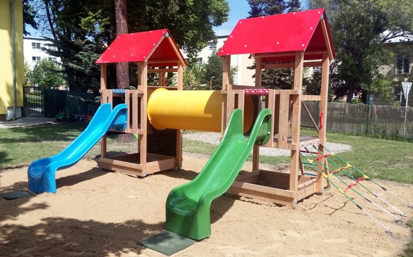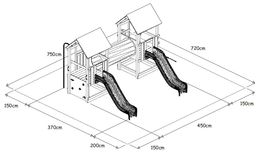 Ein sehr schönes Spielset mit zwei hochwertigen Laminatrutschen, geeignet für Kindergärten, Gemeinden und Restaurants. Der Spielplatz fördert die körperliche Aktivität der Kinder sehr gut und dank der Spielelemente wie Kletterwand, schräges Kletternetz, Feuerstange und Kletterröhre ist für lange Zeit für Spaß gesorgt. Der Spielplatz ist für Kinder im Alter von 3 bis 14 Jahren konzipiert, wobei Kinder im Alter von 3 bis 6 Jahren von Erwachsenen beaufsichtigt werden müssen.