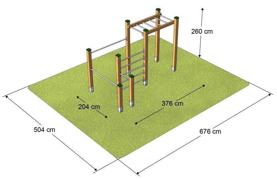 Die Montage hat keine Anforderungen an die Schlagfläche. Sie kann daher direkt auf dem Rasen verankert werden. Sie behält ihr natürliches Aussehen und passt sich so der Umgebung an, egal ob Sie die Anlage in einem Park oder einem Wald aufstellen, aber gleichzeitig stören ihre geraden Linien nicht das moderne Aussehen von Städten und Dörfern. Wir empfehlen jedoch die Verlegung von Rasenplatten Gras oder Saf, um die Grasnarbe unter dem Aufbau vor dem Zertrampeln zu schützen.