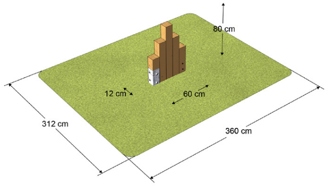 Der Aufbau erfordert keine Aufprallfläche. Daher kann er direkt im Rasen verankert werden. Sie behält ihr natürliches Aussehen und passt sich der Umgebung an, egal ob Sie die Anlage in einem Park oder einem Wald aufstellen, aber gleichzeitig stören ihre geraden Linien nicht das moderne Aussehen von Städten und Dörfern. Wir empfehlen jedoch, GrasGrasplatten unter dem Turm zu verlegen, um die Grasnarbe unter der Anlage vor dem Zertrampeln zu schützen.